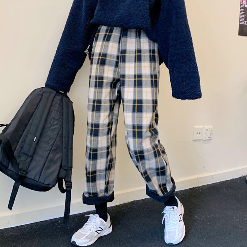 免運 寬鬆格子休閒褲高腰刷毛加絨幾日後闊腿褲ins超火格子褲女 蝦皮購物